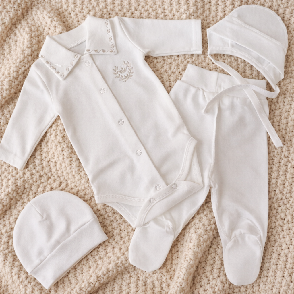 Set nounăscut. Body, pantalonași cu tălpiță, chichiuți, căciuliță. Țesetură bumbac 2 fire.